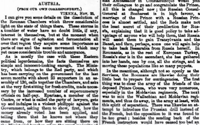 Articolul scris de corespondentul din Viena al publicaţiei londoneze The Times începea cu o relatare despre situaţia politică agitată din anul 1867, la scurt timp după instalarea la conducerea ţării a principelui Carol I de Hohenzoller. A fost ocazia cu care The Times făcea o incursiune în istoria românilor, pentru a dezvălui marile idealuri ale acestui popor, aşa cum erau văzute la acea vreme.