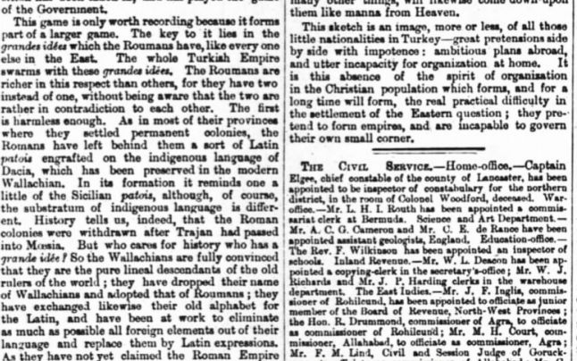 Prima este inofensivă, relata The Times. „Ca în majoritatea fostelor provincii, în care au înfiinţat colonii, romanii au lăsat în urmă un fel de dialect latin altoit cu limbajul indigen al Daciei, care s-a conservat în Valachia modernă. Istoria ne spune într-adevăr că aceste colonii ale romanilor au fost retrase după ce Traian a intrat în Moesia. Dar cui îi pasă de istorie când are idealuri măreţe. Astfel, valahii sunt convinşi pe deplin că ei sunt descendenţii puri ai vechilor stăpâni ai lumii. Au renunţat la numele de valahi şi l-au adoptat pe cel de români. Şi-au schimbat, de asemenea, vechiul lor alfabet cu cel latin şi au încercat eliminarea pe cât de mult posibil a tuturor elementelor străine din limbajul lor, pe care le înlocuiesc cu expresii latine. Deşi nu au revendicat încă Imperiul Roman cu forţa înaintaşilor lor, această idee sau iluzie nu este dăunătoare, ci produce un lucru bun în aducerea lor mai aproape de Vest”, informa The Times, în 1867.