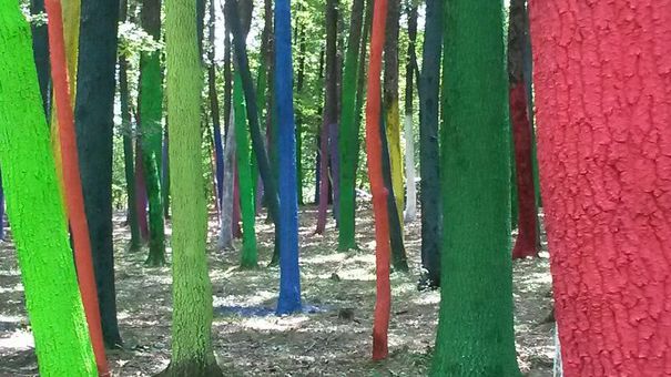 Pădurea Dumbrava din satul Poienari, judeţul Gorj, a devenit atracţie turistică, după ce artistul vizual Mihai Ţopescu a colorat sute de copaci cu vopsea specială, ecologică, pentru a atrage, astfel, atenţia asupra defrişărilor ilegale, transmite corespondentul Mediafax.