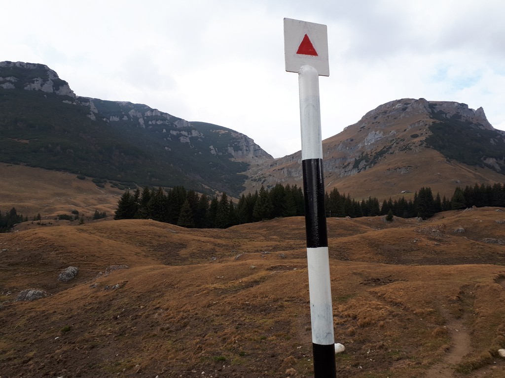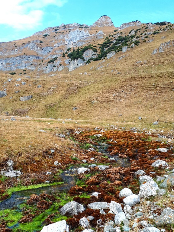 La un moment dat, acest „traseu” facut de ciobani, a intalnit un paraias ce se prelingea peste niste pietre rosiatice si care a format peste ele o pelicula vascoasa. Eram chiar deasupra marcajului GURA DE RAI. Am alergat putin in vale si apoi inapoi ca sa testam teoriile gasite pe net despre disparitia oboselii, reglarea functiilor corpului, energizare, etc…. Cu siguranta obosesti atunci cand ajungi sus dupa un sprint la deal, dar parca oboseala trecea repede. Ce am mai constatat diferit a fost si faptul ca aplicatia busola de pe telefon imi indica un magnetism mai ridicat in comparatie cu cel de pe langa Cascada Doamnelor. Aici aveam in jur de 68 micro Tesla iar pe langa cascada 20-30 micro Tesla. Interesant! Acasa sau la munca unde sunt inconjurat de calculatoare, televizoare s.a.m.d busola imi indica 50 micro Tesla dar aici in mijlocul naturii nu aveam asa ceva…
